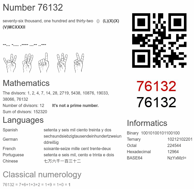 If you know something interesting about the number 76132 or any natural number (positive integer), please write to us.What is 76,132 in other units