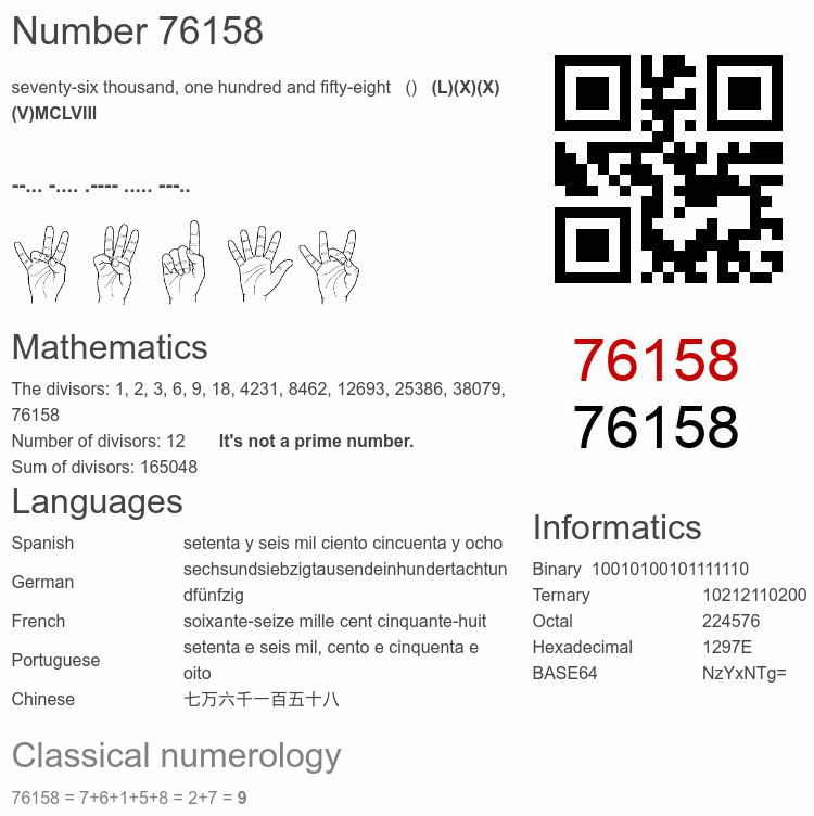 If you know something interesting about the number 76158 or any natural number (positive integer), please write to us.What is 76,158 in other units
