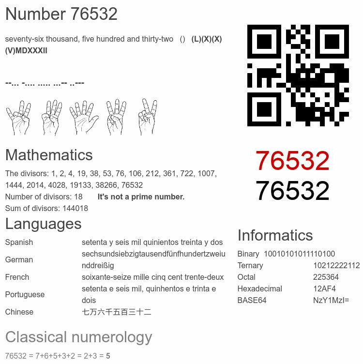 If you know something interesting about the number 76532 or any natural number (positive integer), please write to us.What is 76,532 in other units