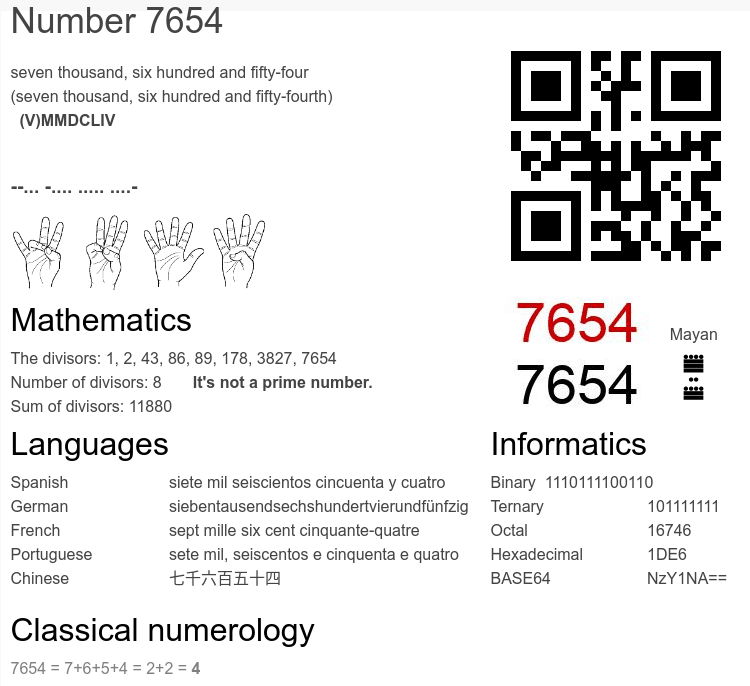 The even number 7,654 is spelled 🔊, and written in words: seven thousand, six hundred and fifty-four. The ordinal number 7654th is said 🔊 and written as: seven thousand, six hundred and fifty-fourth. The meaning of the number 7654 in Maths: Is it Prime? Factorization and prime factors tree. The square root and cube root of 7654. What is 7654 in computer science, numerology, codes and images, writing and naming in other languages. Other interesting facts related to 7654.