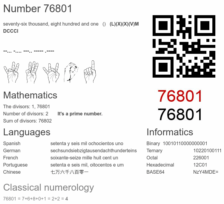 | Portuguese: | 🔊 (número 76 801) | setenta e seis mil, oitocentos e um |