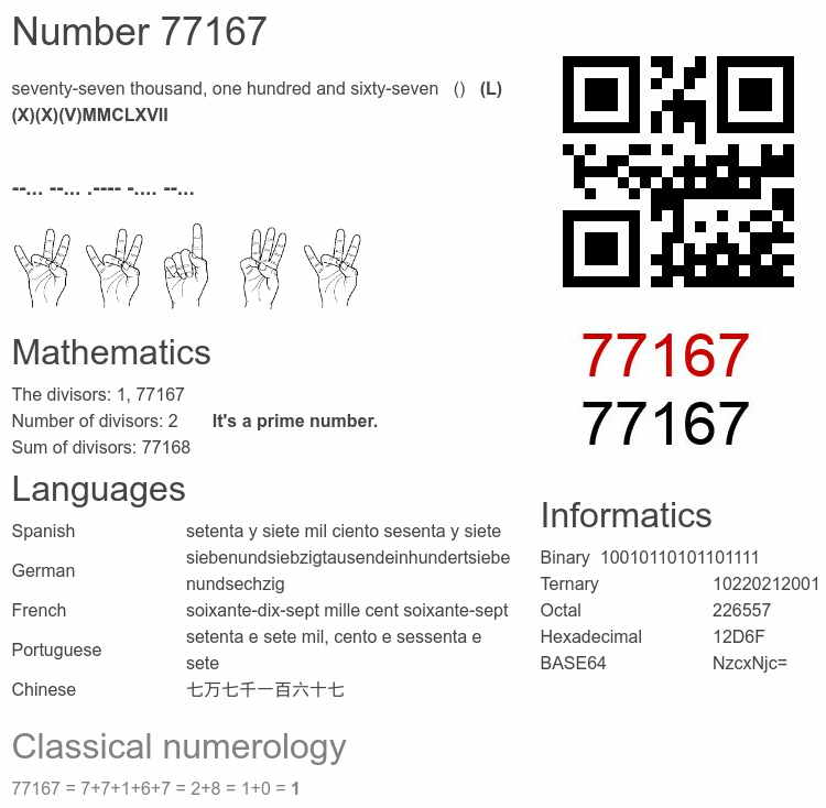 | Spanish: | 🔊 (número 77.167) | setenta y siete mil ciento sesenta y siete |