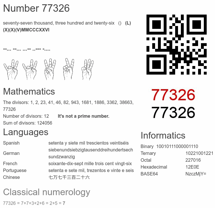 The even number 77,326 is spelled 🔊, and written in words: seventy-seven thousand, three hundred and twenty-six. The ordinal number 77326th is said 🔊 and written as: seventy-seven thousand, three hundred and twenty-sixth. The meaning of the number 77326 in Maths: Is it Prime? Factorization and prime factors tree. The square root and cube root of 77326. What is 77326 in computer science, numerology, codes and images, writing and naming in other languages. Other interesting facts related to 77326.