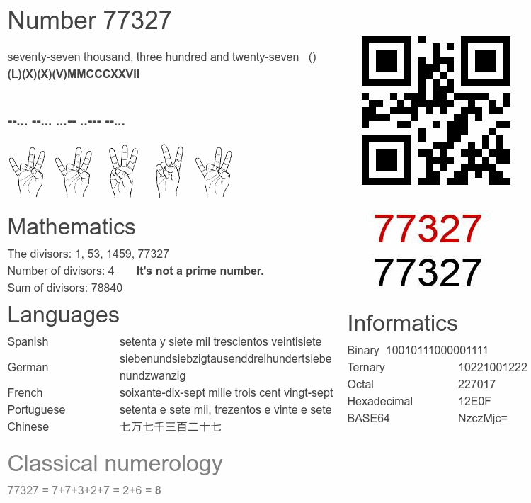 The odd number 77,327 is spelled 🔊, and written in words: seventy-seven thousand, three hundred and twenty-seven. The ordinal number 77327th is said 🔊 and written as: seventy-seven thousand, three hundred and twenty-seventh. The meaning of the number 77327 in Maths: Is it Prime? Factorization and prime factors tree. The square root and cube root of 77327. What is 77327 in computer science, numerology, codes and images, writing and naming in other languages. Other interesting facts related to 77327.
