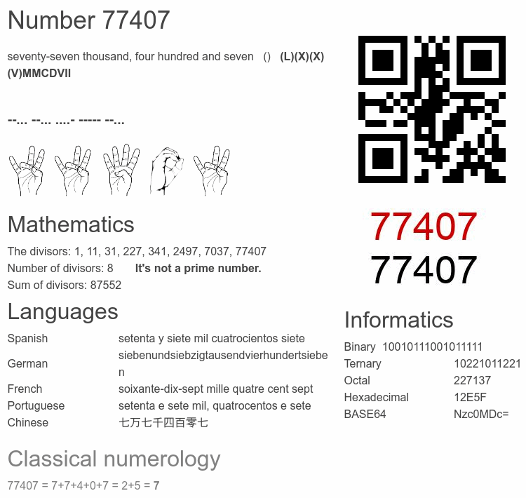 | Spanish: | 🔊 (número 77.407) | setenta y siete mil cuatrocientos siete |