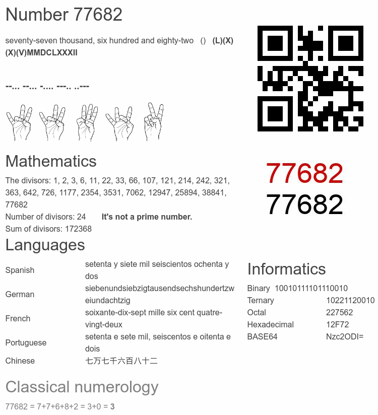 | Arabian: | 🔊 (عدد 77,682) | سبعة و سبعون ألفاً و ستمائةاثنان و ثمانون |