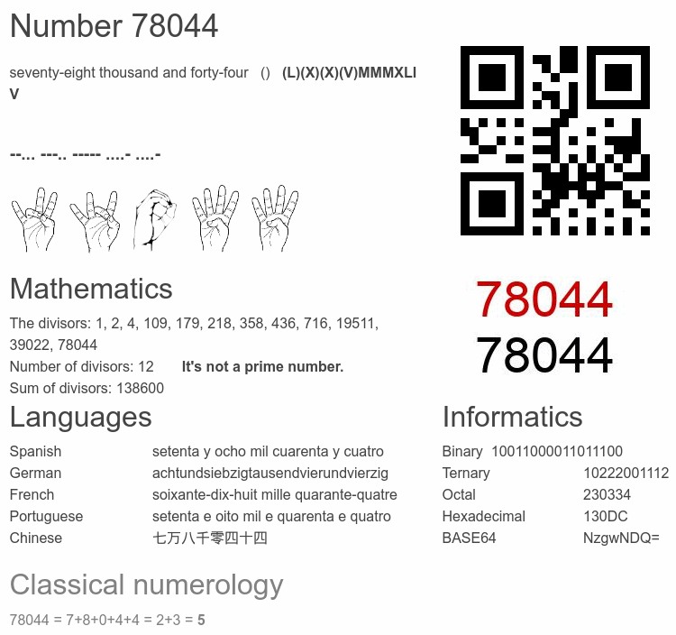 | Spanish: | 🔊 (número 78.044) | setenta y ocho mil cuarenta y cuatro |