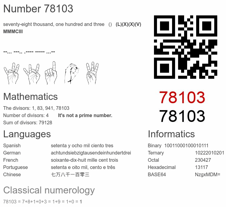 | Japanese: | 🔊 (数 78,103) | 七万八千百三 |