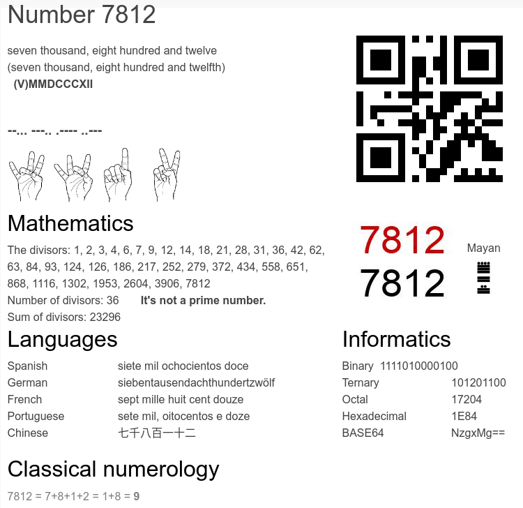 The even number 7,812 is spelled 🔊, and written in words: seven thousand, eight hundred and twelve. The ordinal number 7812nd is said 🔊 and written as: seven thousand, eight hundred and twelfth. The meaning of the number 7812 in Maths: Is it Prime? Factorization and prime factors tree. The square root and cube root of 7812. What is 7812 in computer science, numerology, codes and images, writing and naming in other languages. Other interesting facts related to 7812.