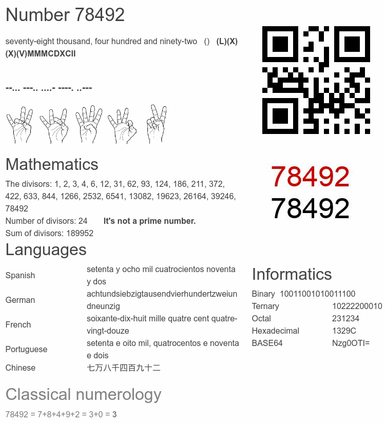 If you know something interesting about the number 78492 or any natural number (positive integer), please write to us.What is 78,492 in other units
