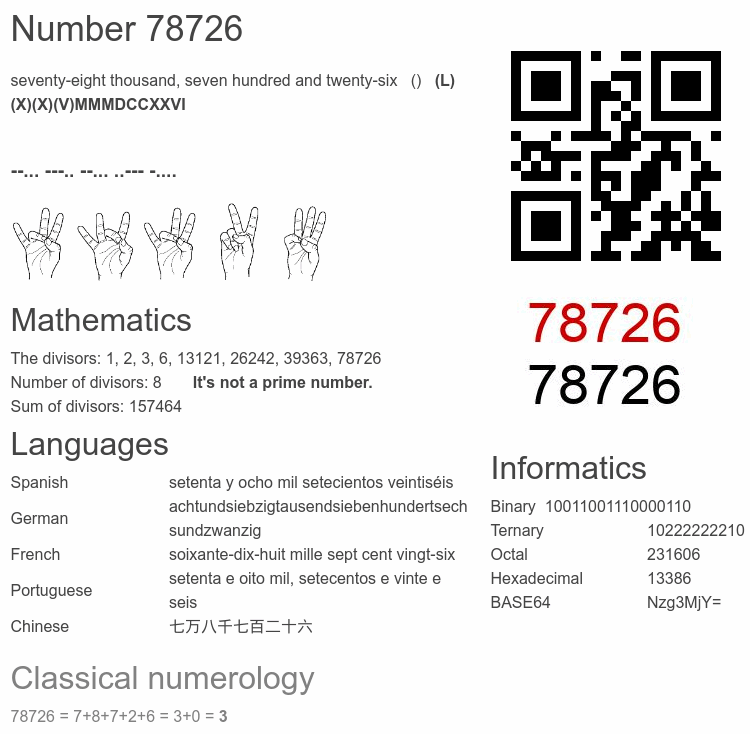 The even number 78,726 is spelled 🔊, and written in words: seventy-eight thousand, seven hundred and twenty-six. The ordinal number 78726th is said 🔊 and written as: seventy-eight thousand, seven hundred and twenty-sixth. The meaning of the number 78726 in Maths: Is it Prime? Factorization and prime factors tree. The square root and cube root of 78726. What is 78726 in computer science, numerology, codes and images, writing and naming in other languages. Other interesting facts related to 78726.