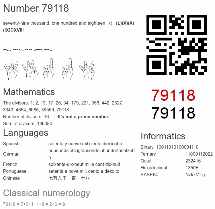 | Portuguese: | 🔊 (número 79 118) | setenta e nove mil, cento e dezoito |
