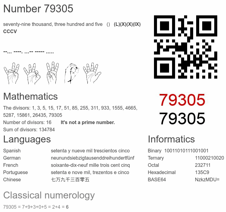 The odd number 79,305 is spelled 🔊, and written in words: seventy-nine thousand, three hundred and five. The ordinal number 79305th is said 🔊 and written as: seventy-nine thousand, three hundred and fifth. The meaning of the number 79305 in Maths: Is it Prime? Factorization and prime factors tree. The square root and cube root of 79305. What is 79305 in computer science, numerology, codes and images, writing and naming in other languages. Other interesting facts related to 79305.