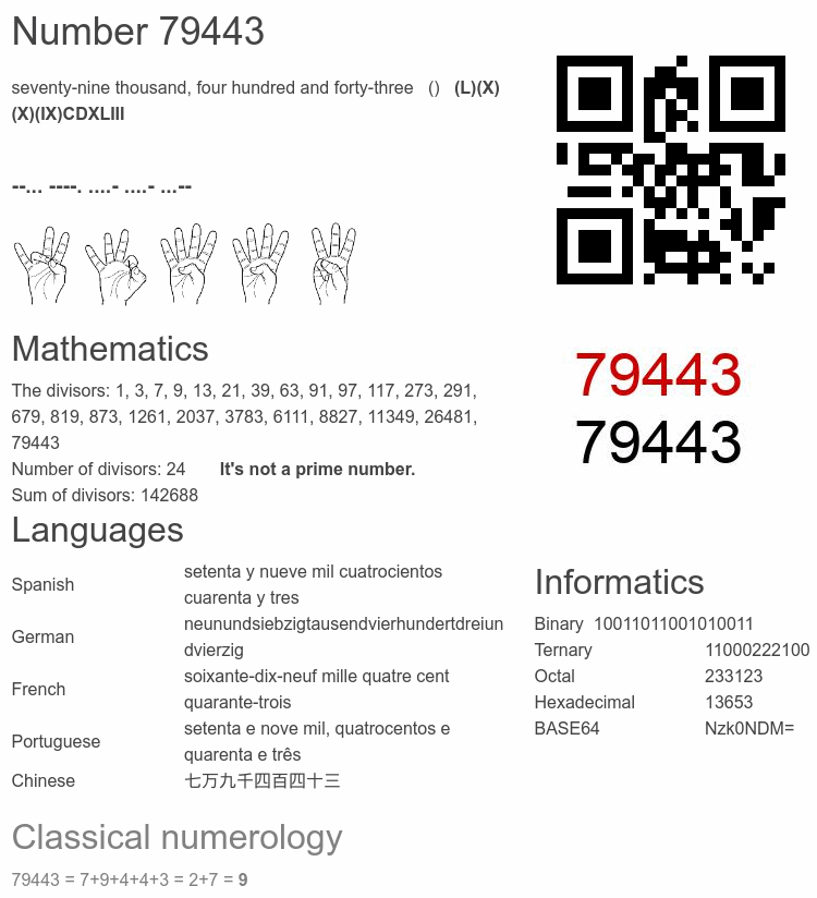 If you know something interesting about the number 79443 or any natural number (positive integer), please write to us.What is 79,443 in other units
