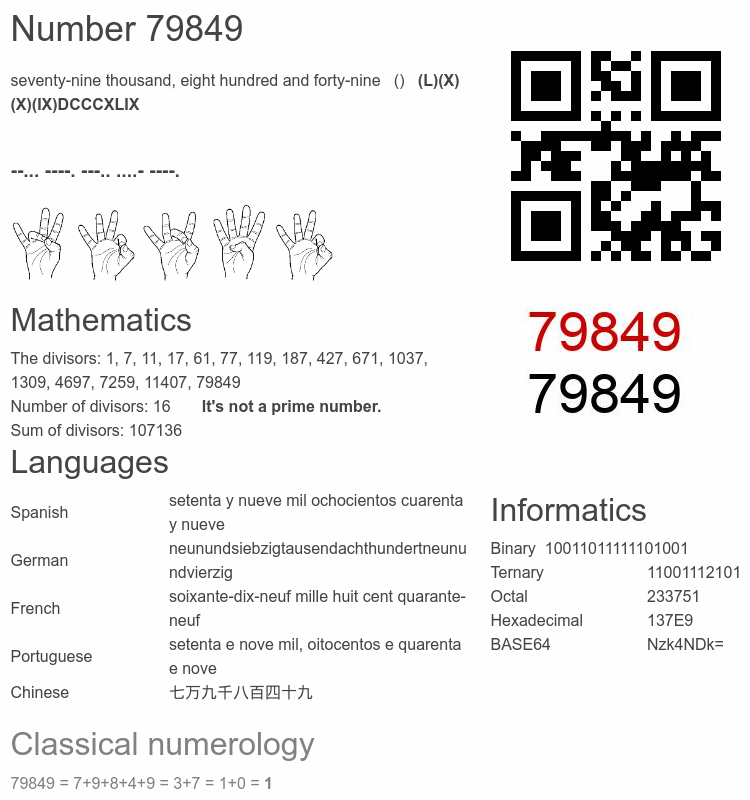 | Portuguese: | 🔊 (número 79 849) | setenta e nove mil, oitocentos e quarenta e nove |