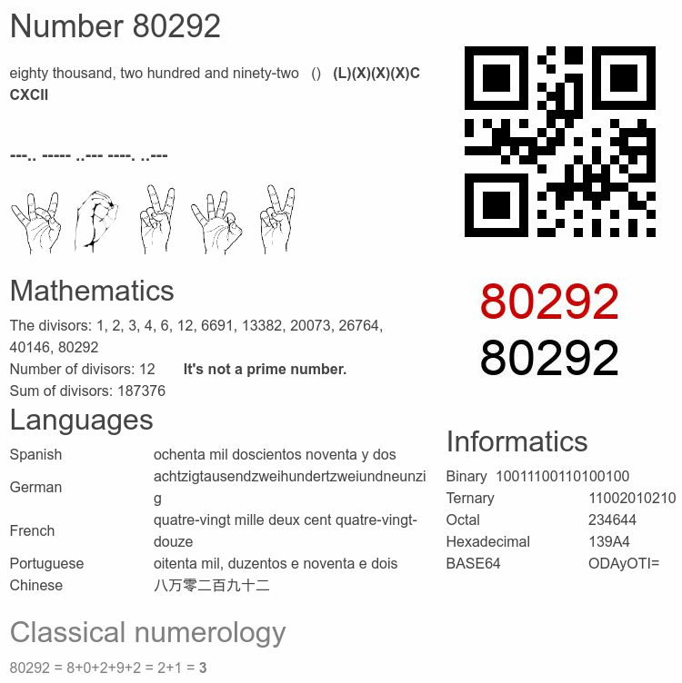 | Spanish: | 🔊 (número 80.292) | ochenta mil doscientos noventa y dos |