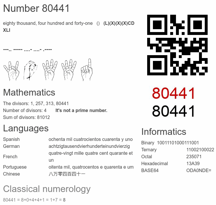 | Arabian: | 🔊 (عدد 80,441) | ثمانون ألفاً و أربعمائة و واحد و أربعون |