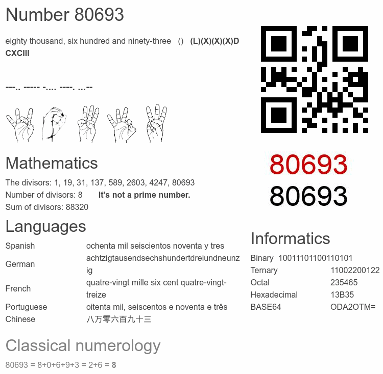 | Chinese: | 🔊 (数 80 693) | 八万零六百九十三 |