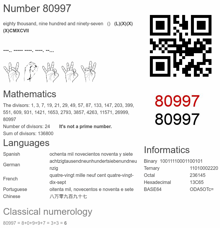 | Hindi: | 🔊 (संख्या 80 997) | अस्सी हज़ार, नौ सौ, सत्तानवे |