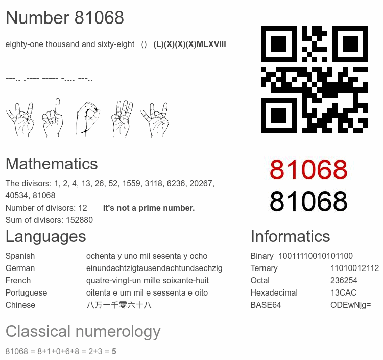 | Spanish: | 🔊 (número 81.068) | ochenta y uno mil sesenta y ocho |