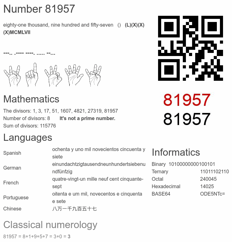 | Spanish: | 🔊 (número 81.957) | ochenta y uno mil novecientos cincuenta y siete |