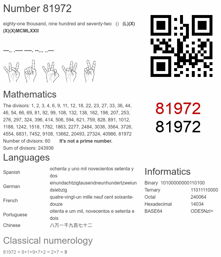 | Hindi: | 🔊 (संख्या 81 972) | इक्यासी हज़ार, नौ सौ, बहत्तर |