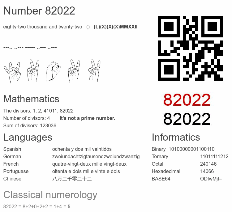 | Spanish: | 🔊 (número 82.022) | ochenta y dos mil veintidós |