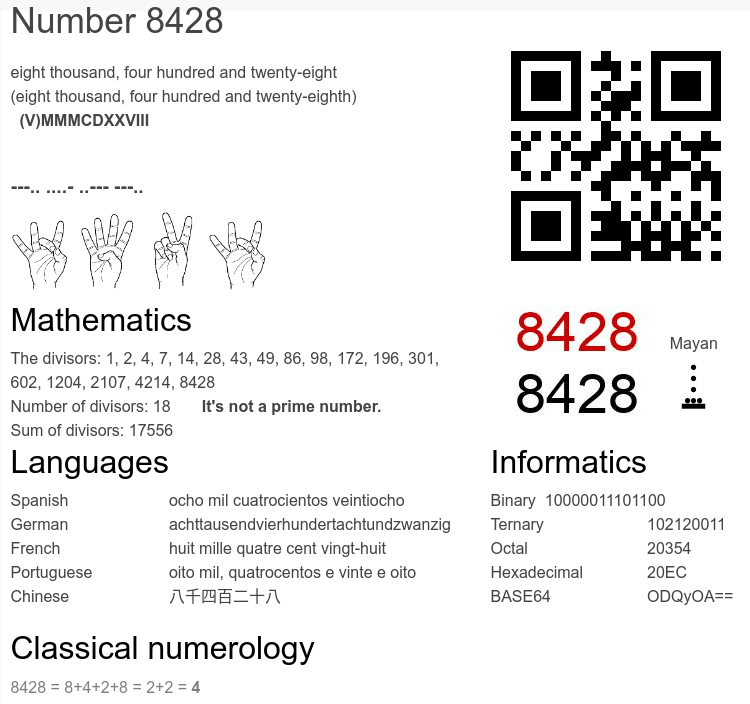 The even number 8,428 is spelled 🔊, and written in words: eight thousand, four hundred and twenty-eight. The ordinal number 8428th is said 🔊 and written as: eight thousand, four hundred and twenty-eighth. The meaning of the number 8428 in Maths: Is it Prime? Factorization and prime factors tree. The square root and cube root of 8428. What is 8428 in computer science, numerology, codes and images, writing and naming in other languages. Other interesting facts related to 8428.