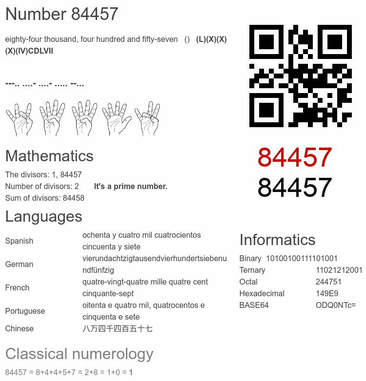 The odd number 84,457 is spelled 🔊, and written in words: eighty-four thousand, four hundred and fifty-seven. The ordinal number 84457th is said 🔊 and written as: eighty-four thousand, four hundred and fifty-seventh. The meaning of the number 84457 in Maths: Is it Prime? Factorization and prime factors tree. The square root and cube root of 84457. What is 84457 in computer science, numerology, codes and images, writing and naming in other languages. Other interesting facts related to 84457.