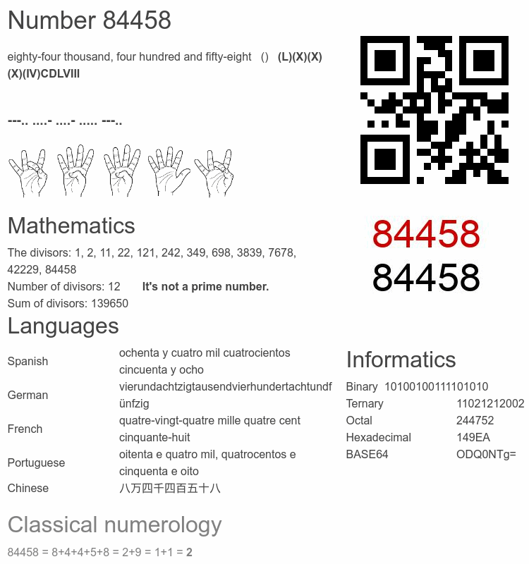 | Norwegian: | 🔊 (nummer 84 458) | åtti-fire tusen, fire hundre og femti-åtte |