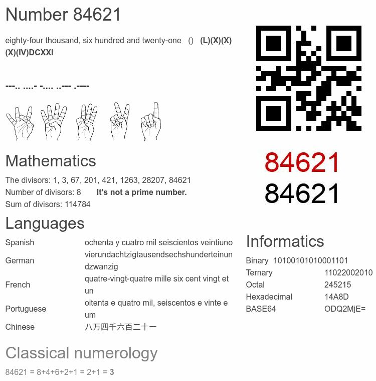 If you know something interesting about the number 84621 or any natural number (positive integer), please write to us.What is 84,621 in other units