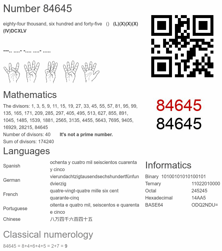 | Arabian: | 🔊 (عدد 84,645) | أربعة و ثمانون ألفاً و ستمائة و خمسة و أربعون |