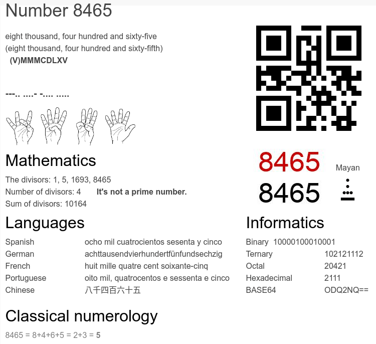 | Hebrew: | (מספר 8,465) | שמונת אלפים ארבע מאות ששים וחמש |