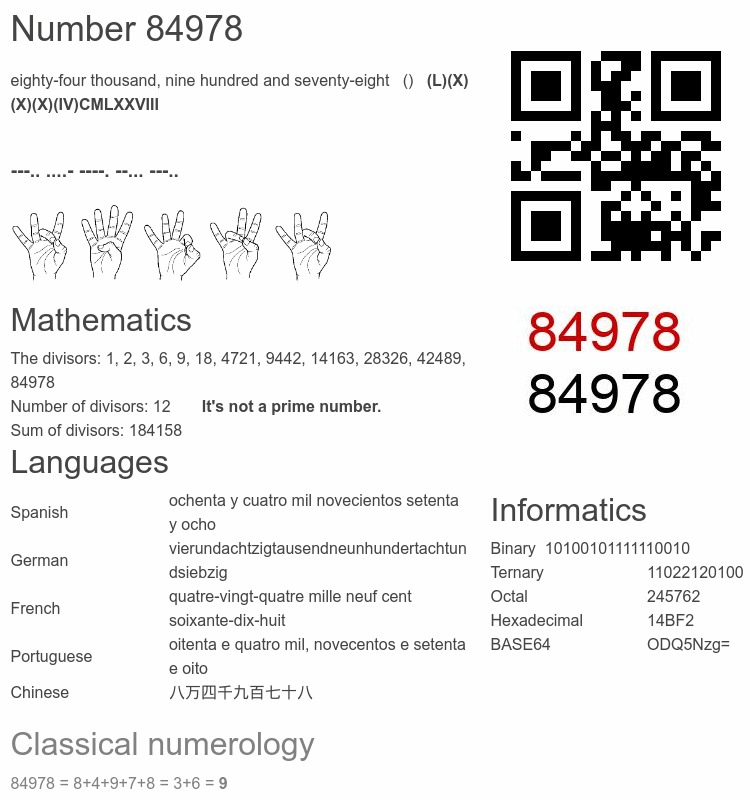 The even number 84,978 is spelled 🔊, and written in words: eighty-four thousand, nine hundred and seventy-eight. The ordinal number 84978th is said 🔊 and written as: eighty-four thousand, nine hundred and seventy-eighth. The meaning of the number 84978 in Maths: Is it Prime? Factorization and prime factors tree. The square root and cube root of 84978. What is 84978 in computer science, numerology, codes and images, writing and naming in other languages. Other interesting facts related to 84978.