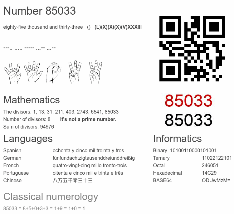 | Portuguese: | 🔊 (número 85 033) | oitenta e cinco mil e trinta e três |
