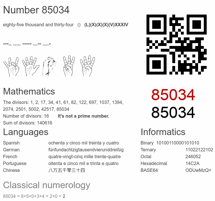| Portuguese: | 🔊 (número 85 034) | oitenta e cinco mil e trinta e quatro |
