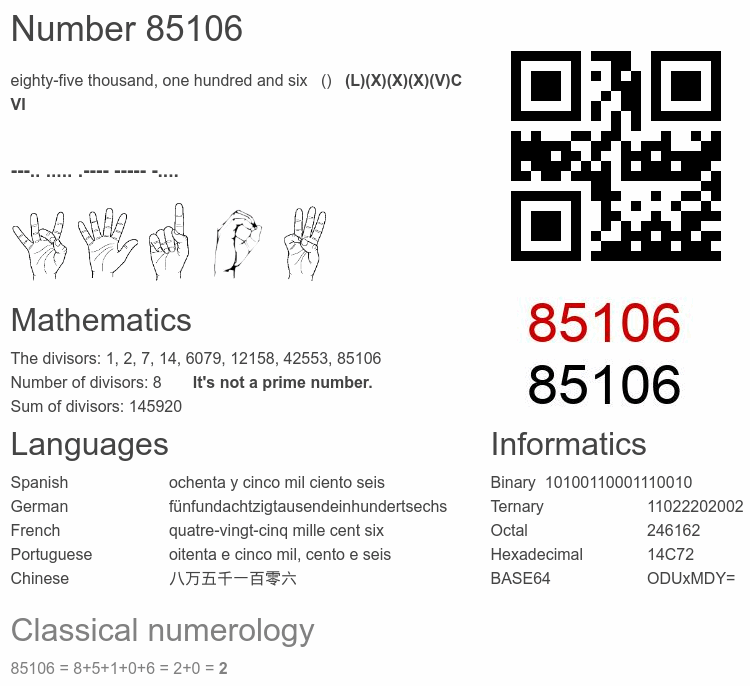 | Chinese: | 🔊 (数 85 106) | 八万五千一百零六 |