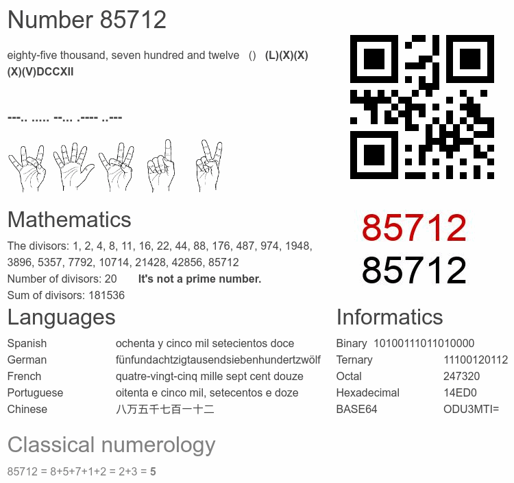 | Portuguese: | 🔊 (número 85 712) | oitenta e cinco mil, setecentos e doze |