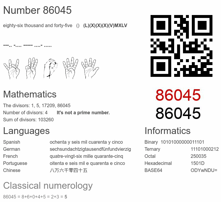 | Chinese: | 🔊 (数 86 045) | 八万六千零四十五 |