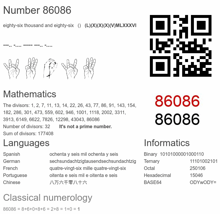 The even number 86,086 is spelled 🔊, and written in words: eighty-six thousand and eighty-six. The ordinal number 86086th is said 🔊 and written as: eighty-six thousand and eighty-sixth. The meaning of the number 86086 in Maths: Is it Prime? Factorization and prime factors tree. The square root and cube root of 86086. What is 86086 in computer science, numerology, codes and images, writing and naming in other languages. Other interesting facts related to 86086.