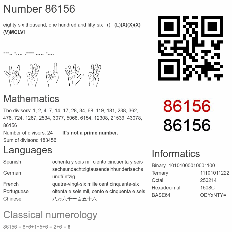 | Portuguese: | 🔊 (número 86 156) | oitenta e seis mil, cento e cinquenta e seis |