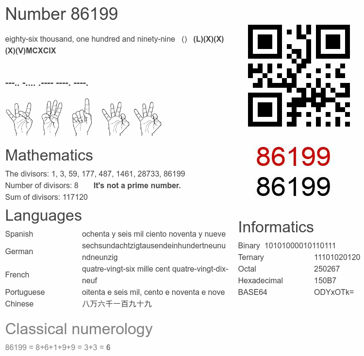 | Spanish: | 🔊 (número 86.199) | ochenta y seis mil ciento noventa y nueve |