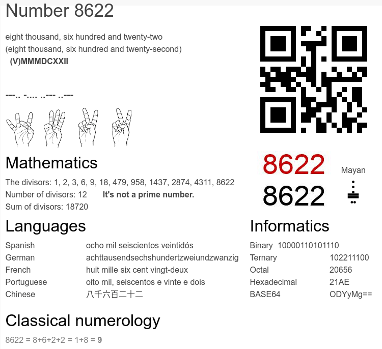 | Spanish: | 🔊 (número 8.622) | ocho mil seiscientos veintidós |
