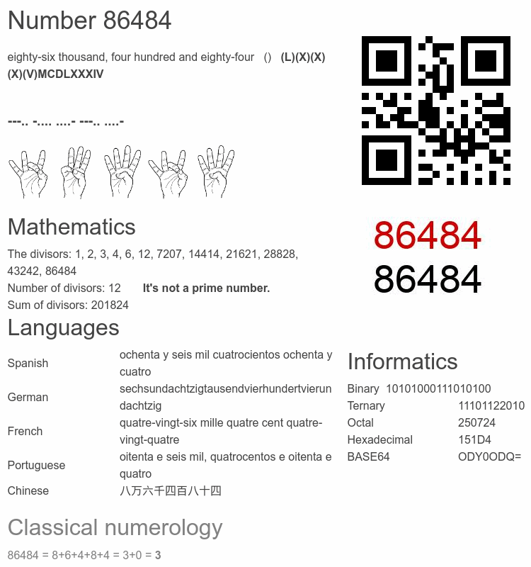| Portuguese: | 🔊 (número 86 484) | oitenta e seis mil, quatrocentos e oitenta e quatro |