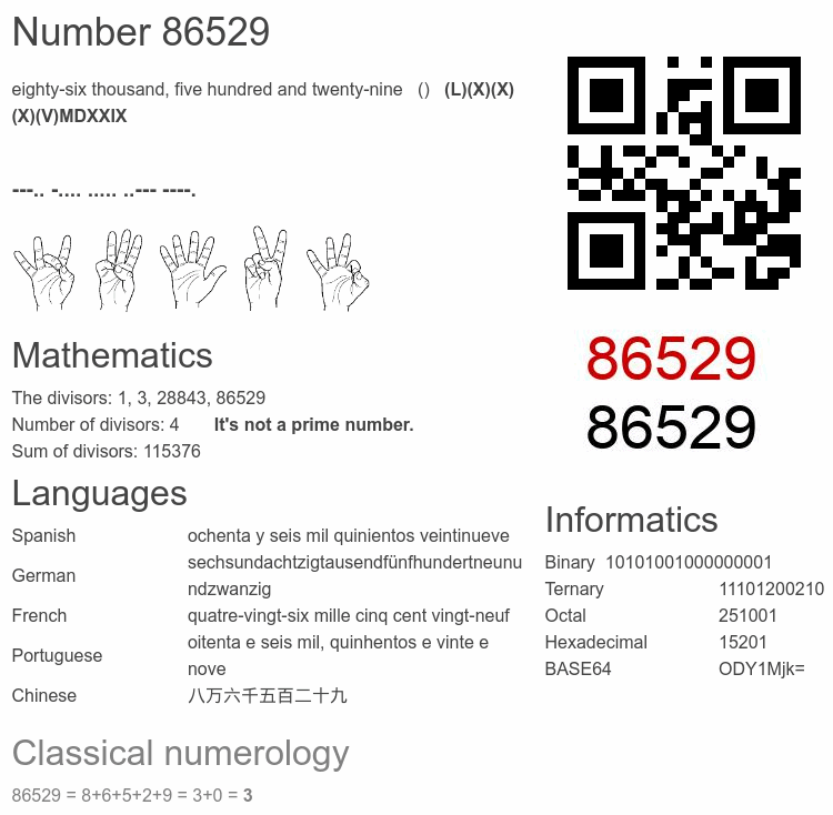 | Spanish: | 🔊 (número 86.529) | ochenta y seis mil quinientos veintinueve |