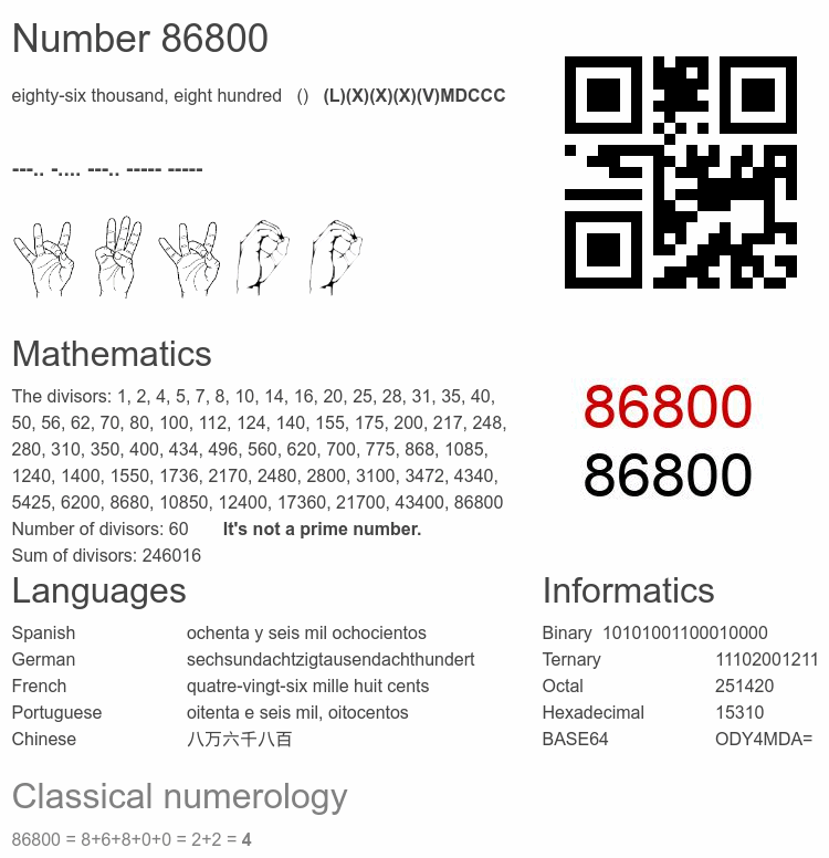 The even number 86,800 is spelled 🔊, and written in words: eighty-six thousand, eight hundred. The ordinal number 86800th is said 🔊 and written as: eighty-six thousand, eight hundredth. The meaning of the number 86800 in Maths: Is it Prime? Factorization and prime factors tree. The square root and cube root of 86800. What is 86800 in computer science, numerology, codes and images, writing and naming in other languages. Other interesting facts related to 86800.