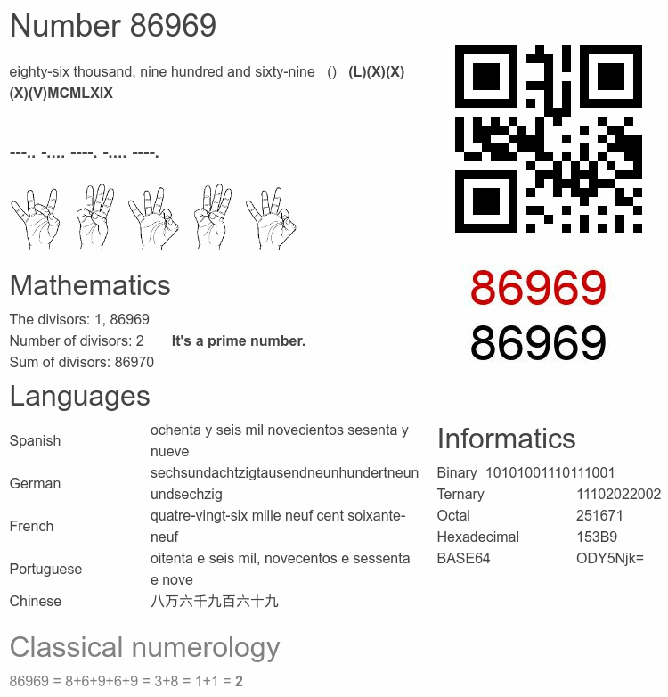 The odd number 86,969 is spelled 🔊, and written in words: eighty-six thousand, nine hundred and sixty-nine. The ordinal number 86969th is said 🔊 and written as: eighty-six thousand, nine hundred and sixty-ninth. The meaning of the number 86969 in Maths: Is it Prime? Factorization and prime factors tree. The square root and cube root of 86969. What is 86969 in computer science, numerology, codes and images, writing and naming in other languages. Other interesting facts related to 86969.