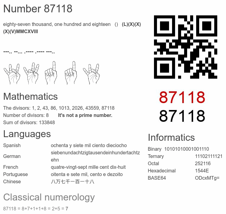 The even number 87,118 is spelled 🔊, and written in words: eighty-seven thousand, one hundred and eighteen. The ordinal number 87118th is said 🔊 and written as: eighty-seven thousand, one hundred and eighteenth. The meaning of the number 87118 in Maths: Is it Prime? Factorization and prime factors tree. The square root and cube root of 87118. What is 87118 in computer science, numerology, codes and images, writing and naming in other languages. Other interesting facts related to 87118.