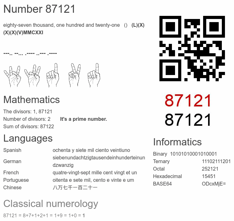 Number 87121 infographic