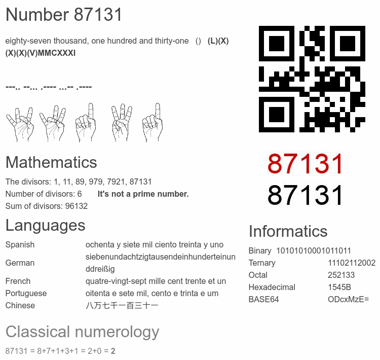 The odd number 87,131 is spelled 🔊, and written in words: eighty-seven thousand, one hundred and thirty-one. The ordinal number 87131st is said 🔊 and written as: eighty-seven thousand, one hundred and thirty-first. The meaning of the number 87131 in Maths: Is it Prime? Factorization and prime factors tree. The square root and cube root of 87131. What is 87131 in computer science, numerology, codes and images, writing and naming in other languages. Other interesting facts related to 87131.